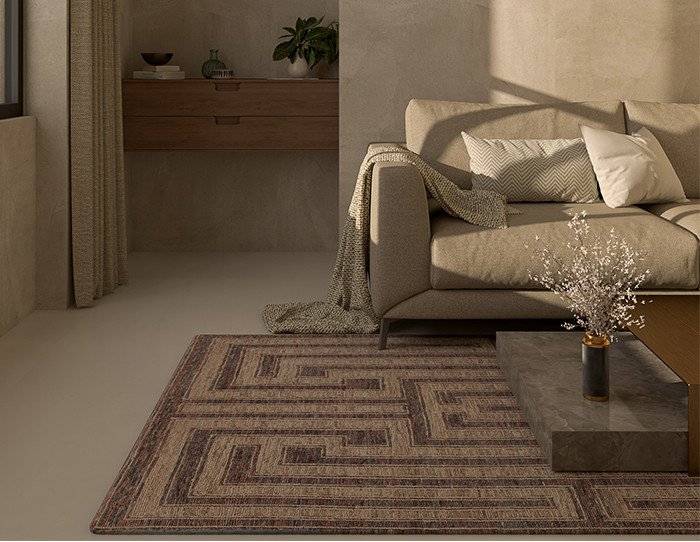 Pairing an earthy rug with a beige couch creates an inviting, grounded feel—perfect for spaces with natural light and organic materials like wood and stone.