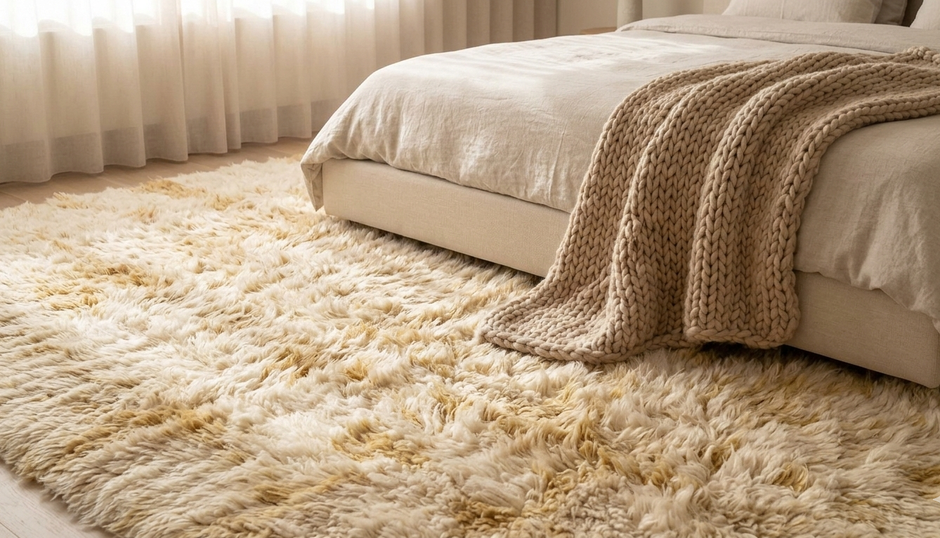 A cozy bedroom interior photograph filled with soft, warm morning light. The central focus is a very thick, plush, fluffy Indian wool carpet in cream and muted gold, which dramatically displays a luxurious, deep-pile texture. The cozy carpet is placed beside a platform bed dressed in light linen, highlighting the contrast in tactile materials.