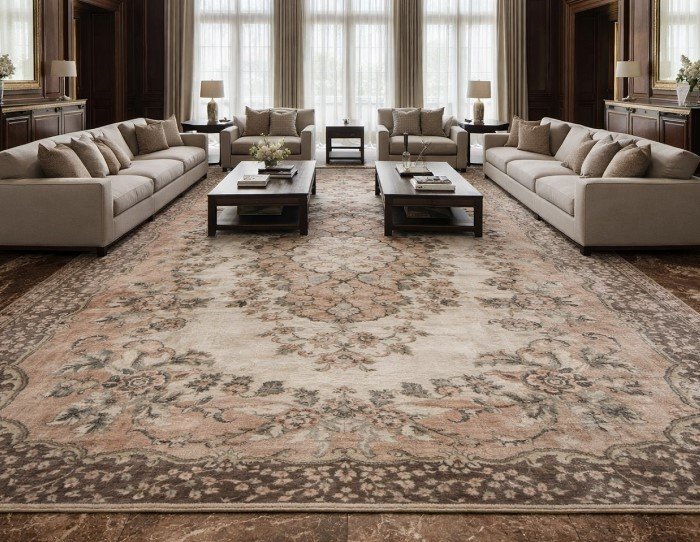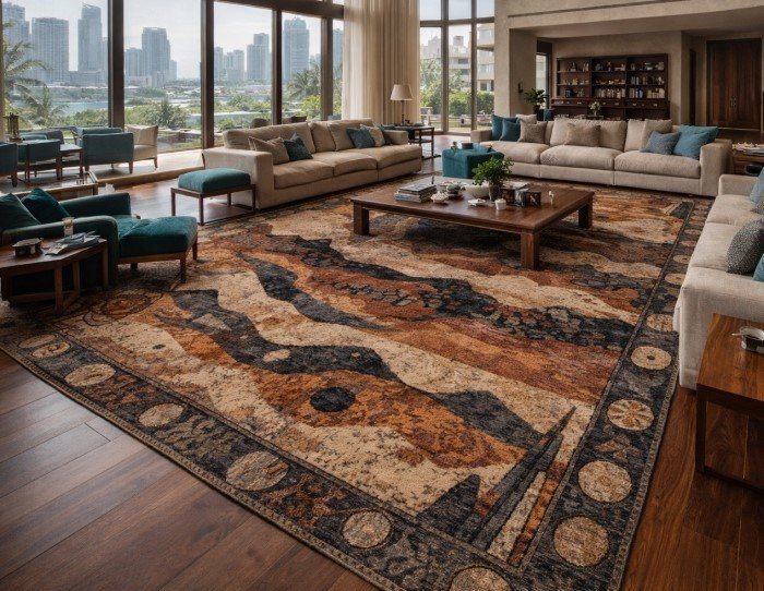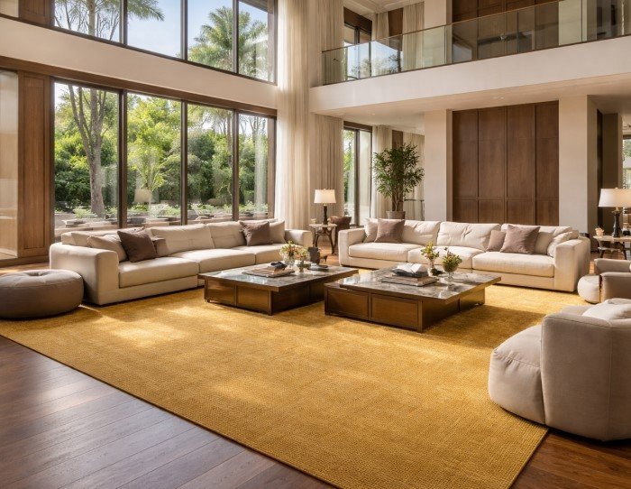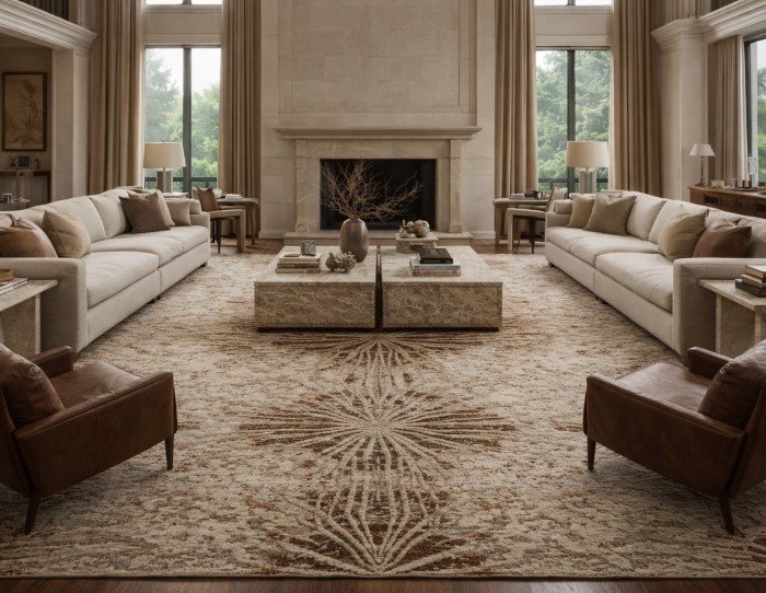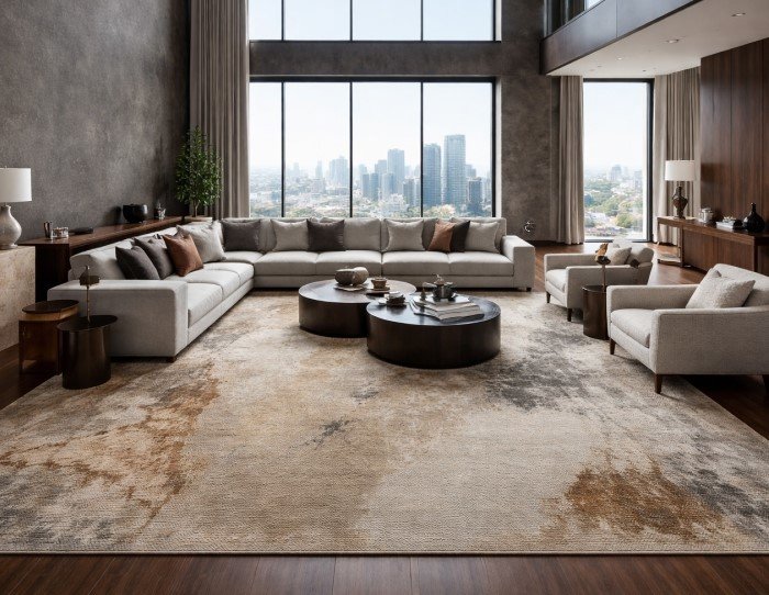 Design Tip: Choose statement rugs with subtle gold silk threading for a high-end, shimmering finish.