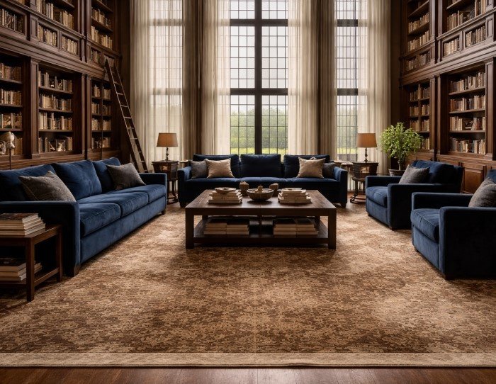 Luxurious library with tall wooden bookshelves, navy blue sofas, armchairs, large wooden coffee table, patterned area rug, and multi-pane window with sheer curtains