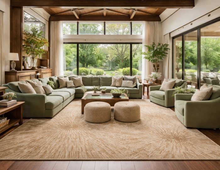 Design Tip: Use hand knotted rugs with leaf patterns to tie the greens and browns together naturally.